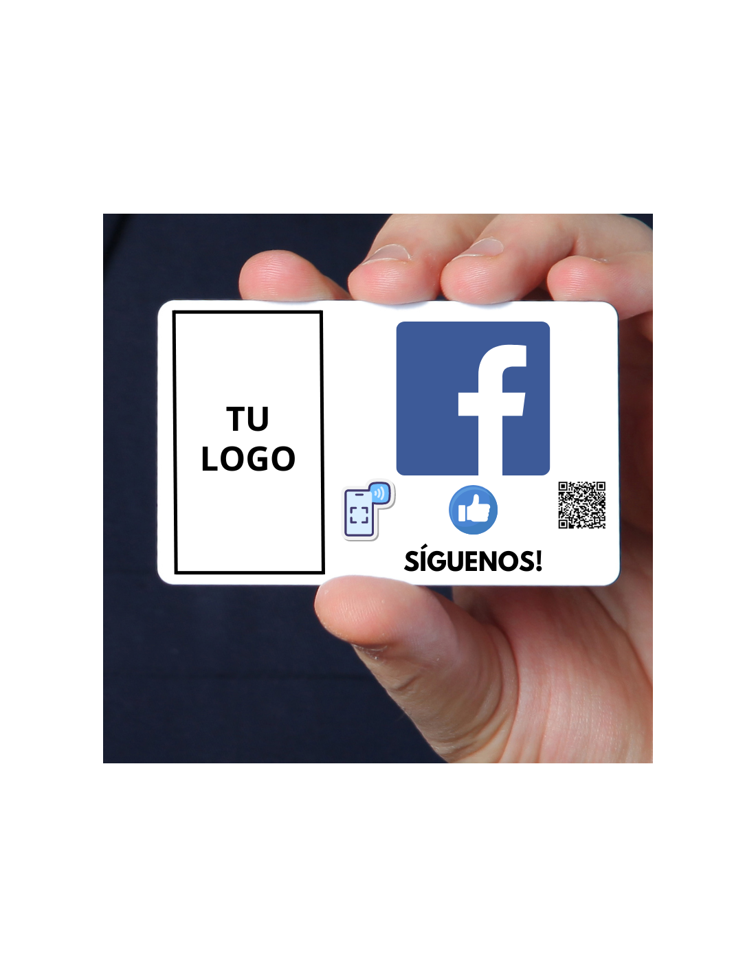 La tecnología NFC integrada en esta tarjeta permite a tus seguidores potenciales acceder instantáneamente a tu perfil de Facebook con un simple toque de sus dispositivos compatibles.